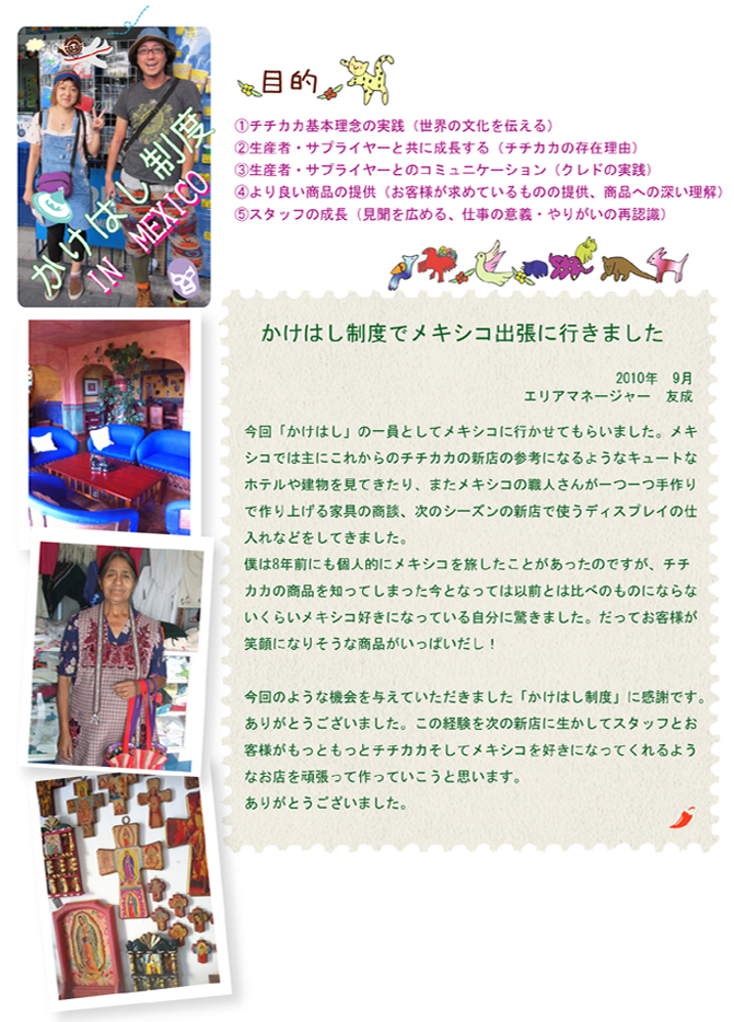 チチカカの基本理念である「世界の文化を伝える」ための行動として、チチカカのスタッフが(その主要業務以外で)海外の取引先各国へ行き、お客様・スタッフと世界の人々をつなぐ「かけはし」となる海外出張制度がスタートしました。サプライヤーや生産者とのコミュニケーションを深めるとともに、商品にまつわる歴史やストーリーの理解を深め、より良い商品を提供するために取引先やサプライヤーと共に成長することを目的としています。